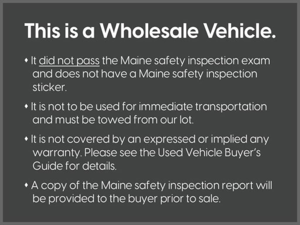 This vehicle is sold AS IS with NO WARRANTY. We have performed a Maine State Inspection to, determine what safety repairs are needed to pass for a sticker and will provide the buyer with the, inspection report identifying the item(s) that caused the vehicle to fail the state's safety, requirements. It is not being sold for the purpose of immediate transportation and it must be towed, from the lot., Exterior Parking Camera Rear, Remote Keyless Entry, Remote Locking Tailgate.